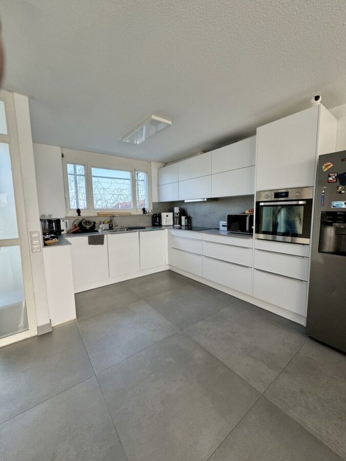 Im unteren Bereich erwartet Sie ein großzügiger, offener Wohn- und Essbereich mit moderner Einbauküche und Zugang zu einer großen Dachterrasse in Südwest-Ausrichtung. Hier genießen Sie mit Blick über Asperg und auf den Hohenasperg bis in die Abendstunden Sonne und traumhafte Sonnenuntergänge. Ein separates Gäste-WC ist ebenfalls vorhanden.